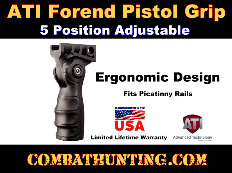 The ATI FPG0100.c Forend Pistol Grip/Vertical Foregrip is for AR15, M16, M4 rifles. Grip is folding 5-Position and fits on forends with picatinny rails. The vertical foregrip is black with 5 adjustable positions to allow for versatile shooting positions and enhance target lock performance under toughest environments mount on any picatinny/weaver rail. Grip is ergonomic and Non-slip for superior control of weapon. Ambidextrous design grip for right and left hand use. ATI Lifetime Warranty. Made in U.S.A.
