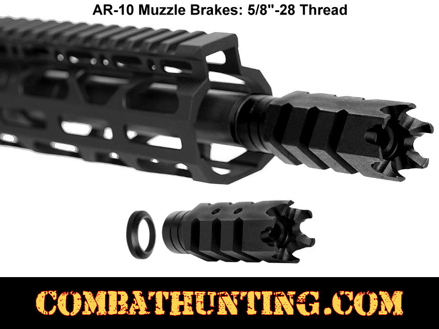 This AR-10 muzzle brake features a 5/8"-28 thread and includes a .308 crush washer kit. It is compatible with .308 rifles, AR-10, LR-308, 7.62x39, .300 AAC, 6.5 SPC, and other .30 caliber AR-style rifles with a 5/8 x 24 thread pitch barrel. Known as the Steel Shark muzzle brake compensator, it is expertly crafted from high-quality steel using precision CNC machining and finished with a military-grade Type III black oxide coating. The AR-10/LR-308 muzzle brake design incorporates porting on the sides and top to minimize back pressure caused by recoil. This mechanism redirects propellant gases to counteract recoil and reduce unwanted muzzle rise, helping maintain accuracy during follow-up shots. Additionally, the muzzle brake features a six-prong aggressive design that enhances its effectiveness as a close-quarters breaching and glass-breaking impact device.