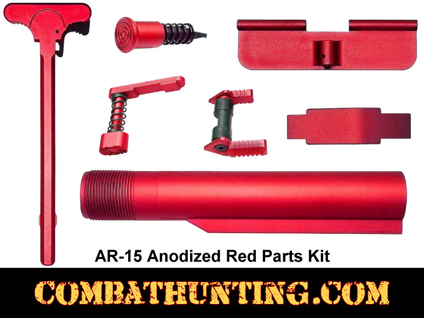 The Tactical AR-15 Anodized Red Parts Kit from Combat Hunting includes precision-machined, red anodized parts/furniture and accessories for your AR-15 build. Each red kit includes a red mil-spec buffer tube, charging handle, forward assist, ejection port cover, trigger guard, ambidextrous safety selector, magazine catch assembly, and all required Allen keys. These anodized red AR parts meet mil-spec tolerances for reliable fit and function across most AR platforms. Durable, effortless to install, and bundled for convenience, this red anodized AR parts kit is a cost-effective solution for shooters who demand both style and performance in their AR combat and hunting rifles. All AR parts are precision engineered and manufactured to the highest standards to enhance your firearm's functionality. The Allen key tools necessary for hassle-free installation are included.