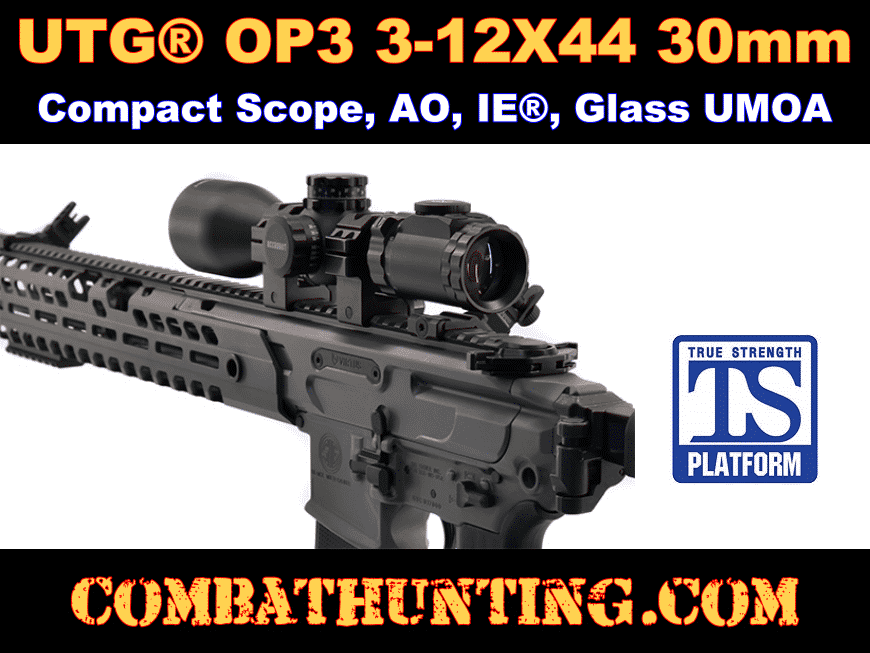 The UTG® OP3 3-12X44 compact scope AO, IE® with UMOA range-estimating etched glass reticle is heavy recoil rated and built on the true strength platform. The tactical rifle scope perfect for bolt action and AR tactical rifles. The UTG® OP3 3-12X44 compact scope is nitrogen-filled, completely sealed, shockproof, fogproof, rainproof, and IPX7 waterproof rated, making it ideal for hunting.This rifle scope with 30mm tube has best in class emerald lens coatings is to achieve maximum light transmission for best clarity. This tactical scope has premium Low Top Zero Lockable and Resettable Target Turrets with precise 1/4 MOA per click adjustment. The UMOA Range Estimating Etched Glass Reticle incorporates an innovative EZ-TAP® Illumination Enhancing (IE®) System with Red/Green Dual-Color and 36 Multi-Color Modes to accommodate all weather and light conditions. The scope has a 1-Click Illumination Memory Feature. Gets the User Right Back to the Color/Brightness Setting Last Used. Low Top Side Wheel Adjustable Turret (SWAT) for Parallax Adjustment from 10 Yards to Infinity. The scopes can be fine tuned with an adjustable/lockable eyepiece diopter. The scope comes complete with Flip-open Lens Caps, 3" Removable Threaded Sunshade, Cleaning Cloth, and Medium Profile Max Strength Twist Lock Picatinny/Weaver Rings for mounting. UTG Lifetime Warranty.