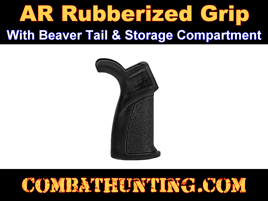 The black AR-15, M4, M16 rubberized pistol grip with beaver tail and storage compartment is an excellent grip upgrade for your AR platform. This AR-15 pistol grip with storage increases upper hand comfort improve trigger operation and reduces wrist fatigue for the shooter. This rubber textured beavertail pistol grip also gives you better rifle retention control. This AR grip with storage compartment has a tight-sealing door for batteries and small cleaning parts. All mounting hardware included. This replacement grip Can be installed on just about any AR Lower Receiver compatible with Mil-Spec AR-15 pistol grips such as AR-15, AR10, LR308, M16A2, M16A3, M16A4, M4, M4A1, Ruger® AR-556, Smith & Wesson M&P®15 etc.