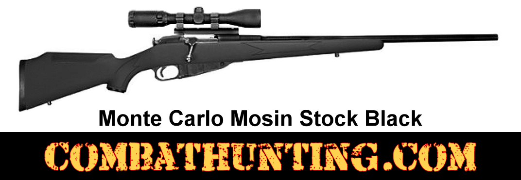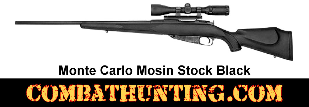 The ATI Mosin Nagant 7.62x54R Monte Carlo Stock replacement upgrade kit from combathunting.com is designed for Mosin Nagant rifle enthusiasts who want to modernize their classic 91/30, M-44, and M38 models. This versatile black tactical Monte Carlo stock, featuring a checkered forearm and grip, fits virtually all Mosin Nagant rifles and carbine variants, making it a broadly compatible upgrade option. This Mosin Nagant Monte Carlo stock is crafted from DuPont extreme-temperature glass-reinforced polymer; the stock is exceptionally durable and virtually indestructible. Its contemporary design not only enhances the rifle's appearance but also boosts functionality. Key features include a comfortable cheek rest, two sling swivel studs for versatile carrying options, and a recoil-reducing butt pad that improves shooting comfort, making it ideal for extended use. Manufactured in the USA and backed by an ATI lifetime warranty, this drop-in stock offers a reliable, high-quality replacement to the original wooden stock. Overall, the Combat Hunting Monte Carlo Stock kit is a practical and stylish choice for shooters looking to improve their Mosin Nagant rifle's performance and aesthetic while enjoying the reassurance of lasting durability and support.