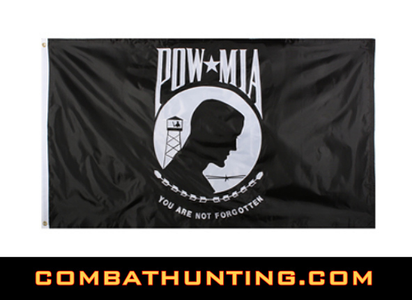 This Durable Deluxe Pow Mia Flag 100% Heavyweight Nylon 3' X 5' printed flag can be displayed either indoors or outdoors. Contains two hosting grommets to attach to pole. 3' x 5'. Military Flag.