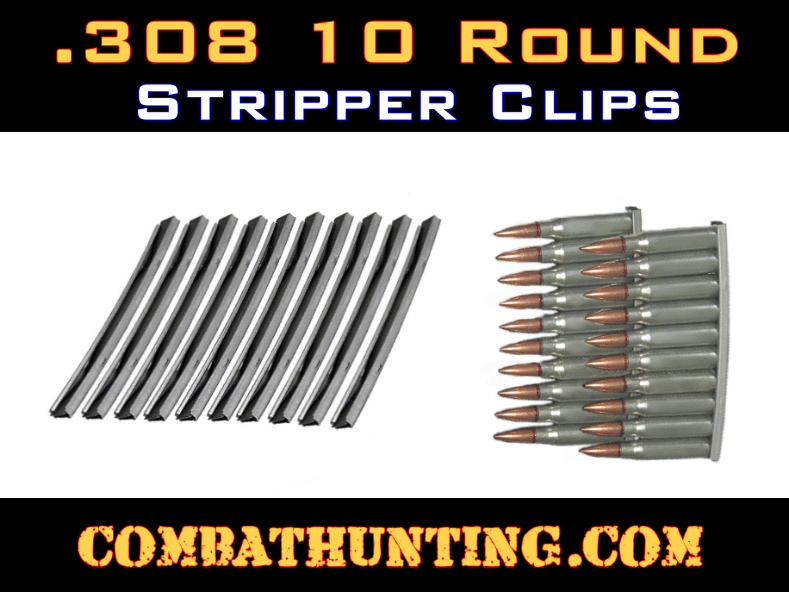 New .308 / 7.62×51mm NATO Stripper Clips, 10 in a pack they will work on most standard .308 rifles & .308 magazines. Allows For Quick Loading Of .308 Magazines. New Production Stripper Clip. These .308 Stripper Clips can be used to quickly load magazines for rifles CETME (308), FN/FAL (Metric), HK 91, HK G3, M14 Rifle, M1A Rifle. May not fit some socom models.