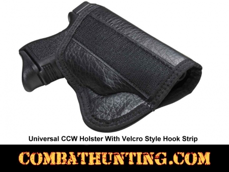 This universal CCW holster fits many semi-auto from duty size to sub-compact pistols. The holster has a 5.25"L X 1.5"W Velcro style hook strip sewn to both sides of the holster for ambidextrous mounting to any surfae with Velcro great for safes and inside jackets. The holster has a soft vinyl outside with soft PVS lining interior materials. Holster is sewn with a trigger guard shape to provide a conforming shape around a pistol and help to protect the trigger area. Holster color is Black.