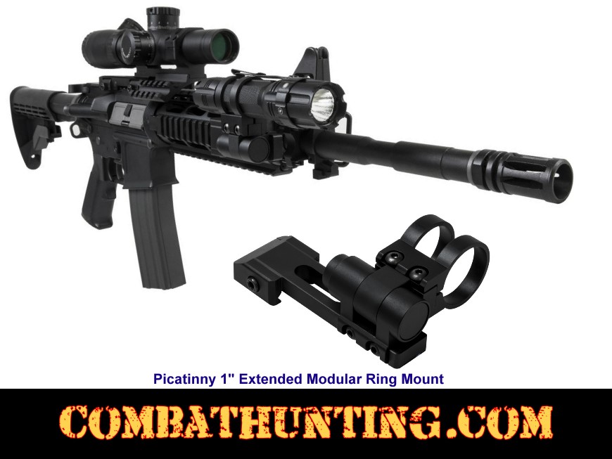 This 1" adjustable offset picatinny rail flashlight mount for shotguns and tactical rifles is an extended modular ring mount for a weapon light or lasers with a one-inch body. This tactical offset flashlight mount is for your rifle or shotgun handguard picatinny rail and has a modular design with three main components for adjustability to meet your weapon application. The tactical flashlight mount base will attach to any Picatinny handguard rail, a three-position mount that can swing to-90°/0°/90° with a spring-loaded push button. This tactical flashlight mount can be configured as a low profile 1" ring mount or can be configured with the three position pivot for flexible mounting positions for your 1" accessory for an easy access configuration. It mounts onto Weaver/Picatinny/ MIL-STD 1913 type rails. The Ring Mount can extend forward past the edge of a handguard for better ergonomics and to free up valuable space on your handguard. The tactical flashlight mount is made from black hard anodized aluminum with steel components for durability.