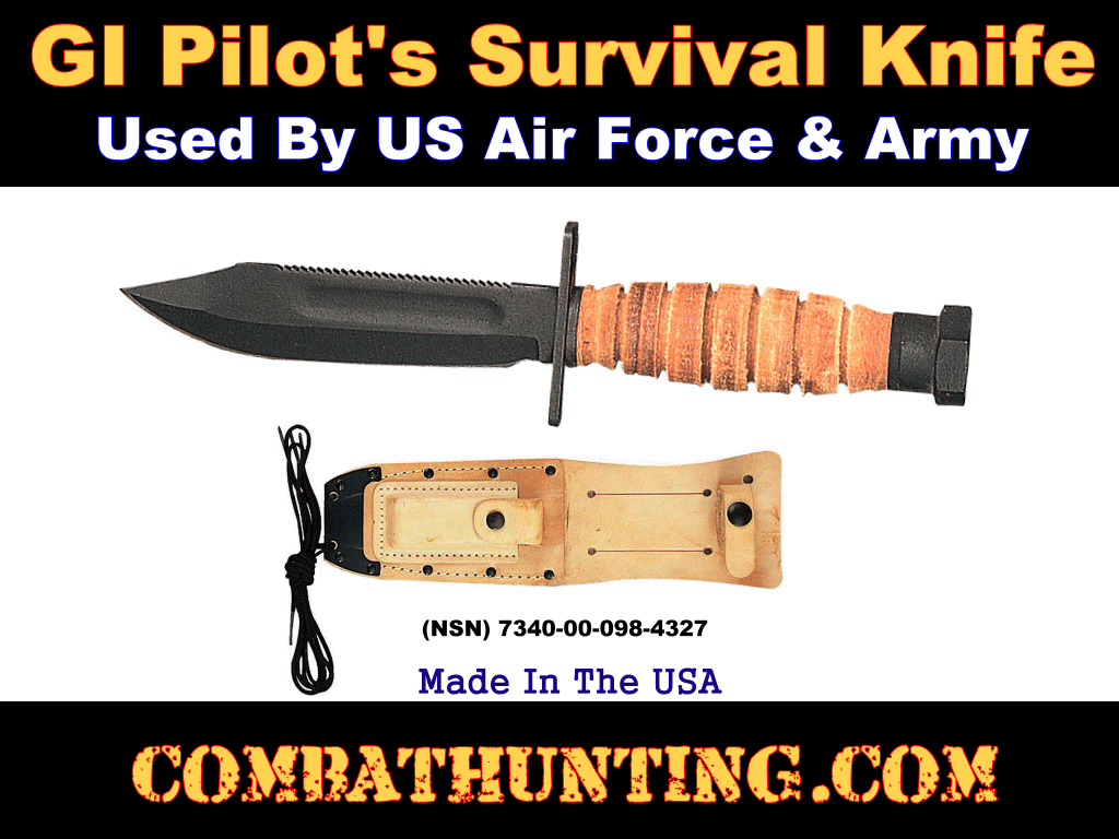 This GI Pilot Survival Knife, also known as an Air Force Pilot Survival Knife, is a genuine issue used by the US Army and Air Force. This GI Ontario USAF military pilot survival knife has a 1095 carbon steel 5" zinc phosphate-finished black blade with a serrated top edge, a leather handle and sheath and a sharpening stone. National Stock Number (NSN) 7340-00-098-4327 GSA Complaint. Made in the United States of America. The US military USAF pilot survival knife was issued to Airforce and navy pilots in case the plane goes down in an emergency. The USAF pilot survival knife was worn on their body and would use a defensive weapon if they did not have a handgun. The pilot survival knife serrations on the back of the blade are uses as a saw or fish scaler. This is a rugged stong survival knife perfect for anyone.