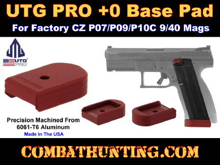 The PUBCZ01R UTG PRO +0 magazine Base Pad For CZ P07/P09/P10C 9/40 factory magazine is precision machined from 6061-T6 aluminum matte red anodized and it is made in USA. The base pad is compatible with (Factory) CZ P07/P09/P10C 9/40 Magazines. The 0.197" extended height and 1 oz weight helps facilitate faster reloads with or without a magwell and IDPA & USPSA allowed. UTG PRO Limited lifetime warranty.