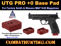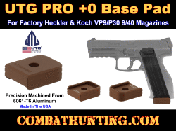 Shop our huge selection of UTG PRO magazine base pads and extended aluminum magazine base plates, parts, and UTG magazine accessories in all colors. The UTG PRO +0 magazine base pads and Glock +5 extended base plates for CZ and Glock are on sale. UTG Pro aluminum magazine base pads/plates are available for your Glock, Sig Sauer, S&W, CZ, HK, XDM, 1911, and Walther PPQ 9-40. The UTG Pro color magazine base plate/pad comes in matte black, red, blue, and bronze hard anodized aluminum, and they are allowed in IDPA and USPSA competition shooting. The UTG Pro magazine base pad-plate is precision CNC machined in the USA and made out of a heavy-duty solid block of hardened aluminum alloy with a lifetime warranty.