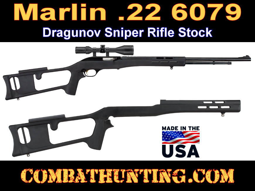 Marlin Model 60 Replacement Tactical Stock Dragunov Sniper Style No gunsmithing, simple installation. Stock Fits Marlin Model 60 semi-automatic rifles, both tube and clip-fed, old and new styles including FITS: Fits Marlin Model 60, 60C, 60SN, 60SB, 60DL, 60SS, 60SSK, 60S-CF, 60SSBL, 60DLX, 990, 990L, 995 and 995SS. etc. Tube or Detachable Mag Models .22LR Stock includes ventilated upper handguard and sling swivel studs. Made for right or left-handed shooters. Made in USA. Mfg Unconditional Lifetime Warranty. MAR3000