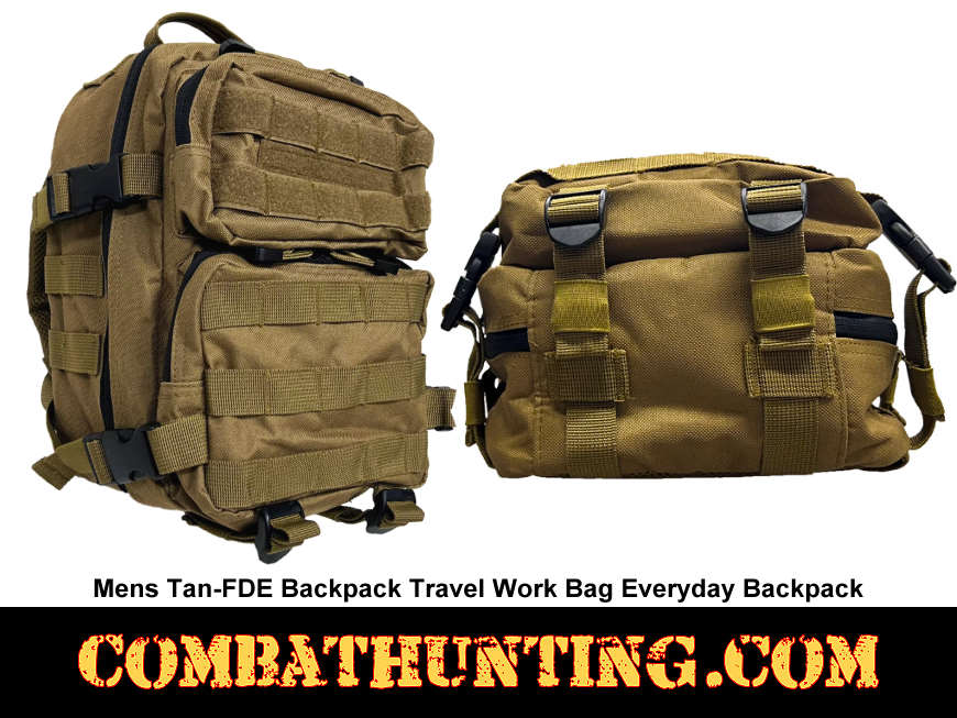 This Men's Tan/FDE Backpack is an excellent choice for both travel and work bag, designed to offer smart storage solutions for everyday use. This everyday backpack features one spacious main compartment along with two smaller compartments, all secured with four cinch straps to keep your items organized and easily accessible. Designed with practicality in mind, the backpack includes a Velcro-style hook-and-loop section on the top compartment, perfect for attaching patches or name tapes. Additionally, MOLLE webbing on the back allows for customization by adding extra pouches, while two adjustable straps at the bottom provide convenient storage for jackets or other extra items you may need on the go. The large main compartment offers an ample 396 cubic inches of storage space, comfortably fitting a variety of belongings. The top pocket measures 7.5”L x 3.5”W x 1.5”D, providing 39 cubic inches of storage, and the bottom compartment is slightly larger at 7.5”L x 6”W x 1.5”D, offering 67 cubic inches of space. Overall, the backpack’s total size is compact yet roomy, measuring 12.5” L x 11.5” W x 3” D. With its thoughtful design and versatile storage options, this backpack is a reliable and functional companion for everyday adventures, whether commuting to work or exploring new places.