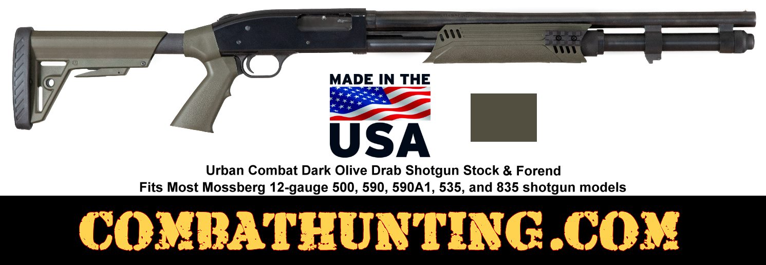 This Urban Combat Dark Olive Drab Mossberg Maverick 88 pistol grip stock and forend with rails is a six-position adjustable stock for tactical shotguns. It features a 12-gauge recoil-reducing pistol grip tactical shotgun stock in Urban Combat Dark Olive Drab. This tactical shotgun stock, grip, and forend from Combathunting.com are compatible with most Mossberg 12 GA models, including the 500, 590, 590A1, 535, and 835, as well as Maverick 88, Remington 870, and Winchester 1200, 1300, and SXP shotguns. The GEN2 Shotforce Universal tactical adjustable stock and forend kit is ideal for users seeking to enhance their firearm’s functionality and comfort. Featuring a 12-gauge recoil-reducing stock with pistol grip, this kit effectively manages recoil, while the ergonomic grip minimizes muzzle lift for improved control. The stock is an AR-15-style mil-spec design with six adjustable positions and a durable buffer tube, crafted from tough yet lightweight DuPont® extreme temperature glass-reinforced polymer. Its Flat Dark Earth finish is weatherproof, making this setup suitable for diverse environments—from Texas to Florida and Alaska. Key highlights include dual-sided QD sling swivel attachment points, an X1 recoil-reducing butt pad for added comfort, and an adjustable length of pull ranging from 12 1/8 inches to 15 inches. Installation is easy thanks to the included instructions, adapters, and mounting hardware, allowing for quick customization. The ATI Gen 2 TactLite shotgun stock features the innovative TracLOCK mounting system, which prevents rattling and ensures smooth, secure adjustments without secondary locks. Manufactured in the USA, this aftermarket stock and forend kit combines rugged durability with practical design and is backed by an ATI limited lifetime warranty. Overall, this tactical stock and forend kit is an excellent choice for anyone seeking enhanced performance, adaptability, and comfort from their shotgun. Its broad compatibility and thoughtful features make it a practical upgrade for both tactical and recreational shooting needs across various environments, from Texas to Florida and Alaska.