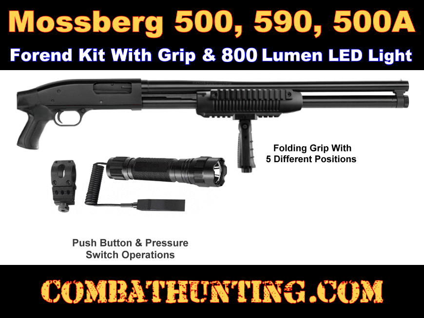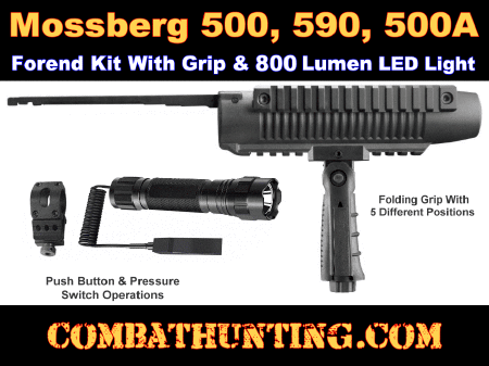 The aftermarket Mossberg 500,590,500A tactical forend/forearm tri-rail kit with three picatinny/weaver rails comes with integrated action slide bar assembly 7-3/4 inches long, 800+ lumens led rechargeable tactical flashlight and forend five position vertical grip the perfect set up for most Mossberg Maverick 88, 500,500A or 590 12 gauge home defense shotguns. This tri rail tactical forend for your Mossberg maverick 88/500/590 12 gauge shotguns features a full-length, bottom rail for grip, and two black anodized aircraft grade aluminum side rails. Forend is made from lightweight but rugged polymer with grooves on the gripping surface that ensures a strong hold on weapon for fast and reliable cycling of your Mossberg shotgun. The 800 Lumen flashlight comes with weapon-mount and can also be handheld. Flashlight features Super Bright LED with integrated reflector for clear area illumination. Flash light has push on, and remote wired pressure switch operations. Flashlight is precision machined from aircraft-grade aluminum with hard anodized black matte finish and mount. Five position adjustable vertical foregrip has Picatinny/weaver style mounting deck with finger grooves for the most comfortable holding of your weapon. Foregrip End cap conceals storage compartment.