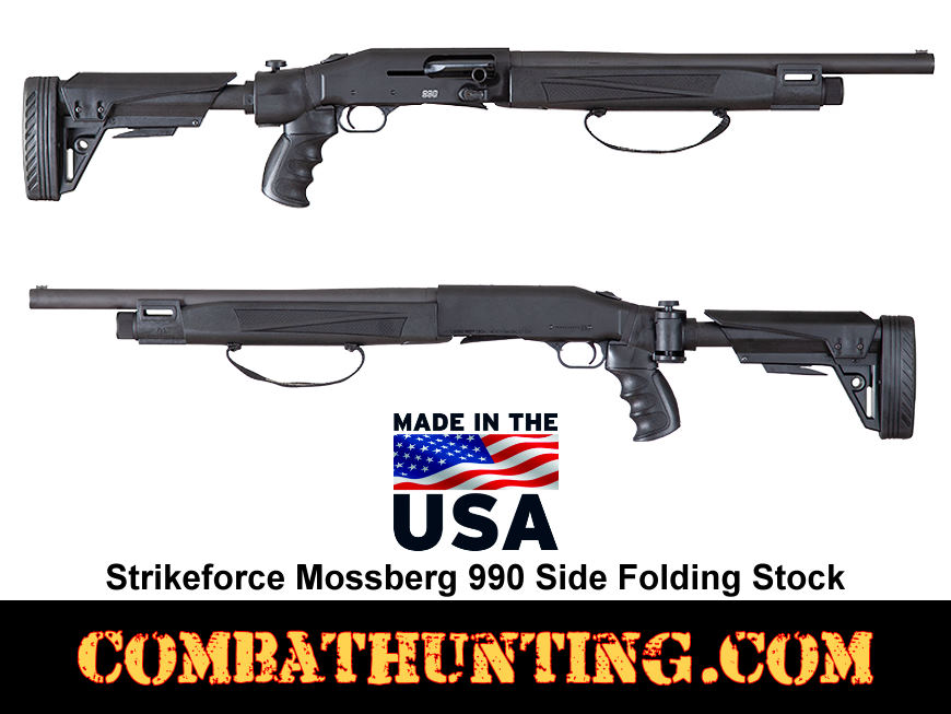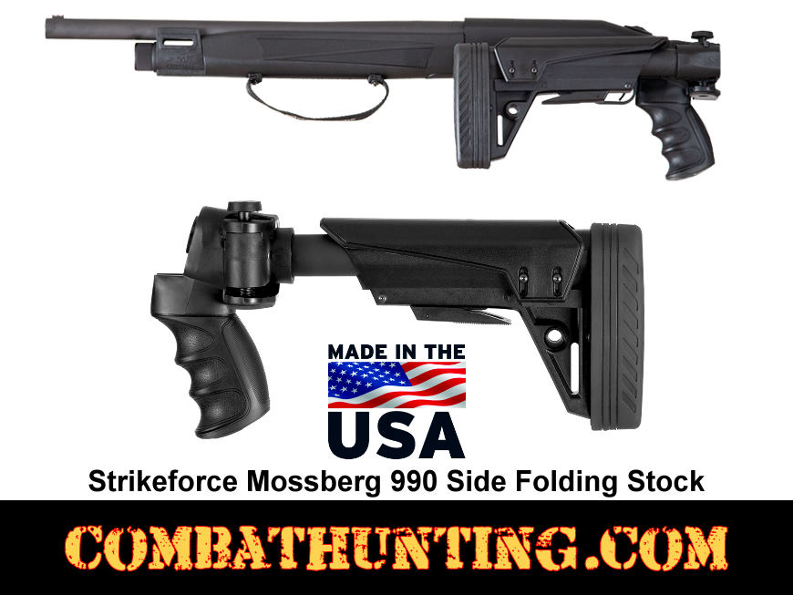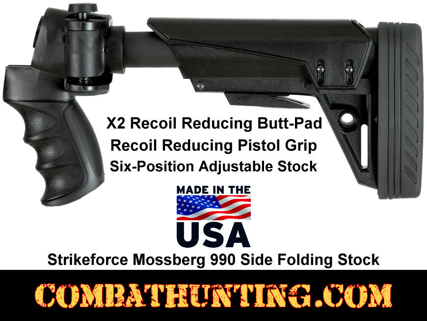 This aftermarket Mossberg 990 Aftershock Folding Stock for the 990 Aftershock 12-gauge semi-auto shotgun features a six-position adjustable design with a recoil-reducing pistol grip and can be fired from the folded position. Engineered for versatility and comfort during combat or hunting, the Strikeforce Side-Folding Stock for the Mossberg 990 shotgun includes a short cheek rest with ½” of adjustment and is designed to fit virtually all users. It incorporates advanced recoil management technology, including the X1 recoil-reducing pistol grip and X2 recoil-reducing butt pad, which significantly reduce muzzle lift and eliminate the felt punch of recoil. The six-position adjustable stock offers a smooth, customizable length of pull, while the dual-sided QD attachment points enhance ease of use with various sling accessories. This black shotgun folding stock is also scratch-proof and weatherproof, ensuring durability in diverse environments. Additionally, the Mossberg 990 Aftershock pistol grip folding stock includes all the mounting hardware and comes with a limited lifetime warranty, showing the manufacturer’s ATI confidence in its quality and performance. It is proudly made in the USA.