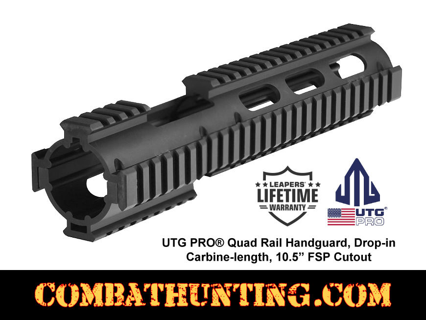 The Leapers MTU015 UTG PRO Quad Rail AR-15 drop-in quad rail extended carbine length handguard with FSP cutout rail fits AR15 carbine length rifles fast and easy. The aluminum handguard fits the standard AR-15 M4 Carbine with an A2 front sight post. The UTG PRO Model 4 AR15 Extended Car Length Drop-in Quad Rail features 4 MIL-SPEC Picatinny rails and a free float extension that allows you to attach the best AR-15 accessories to your carbine length AR15 rifle. This drop-in quad rail handguard with free float extension extends past the front sight tower by almost 2" to provide a longer platform of 10.75" to attach a huge array of handguard accessories. This AR-15 quad rail is the ultimate tactical solution to enhance accuracy in the toughest environments. It has a hard anodized finish for wear and resistance and comes with 18 rubber rail guards for comfort and to protect your quad rail. This quad rail is simple and easy to install; no gunsmith or tools are required. The Quad-Rail allows for maximum heat dissipation, which keeps the barrel cooler. Replaces standard Carbine length 6¾" mil-spec hand guard on model 4,15,16 Colt, Bushmaster XM15 E2S carbine, Smith & Wesson M&P AR15 Sport II and most AR-15 carbine variants. Limited lifetime warranty.