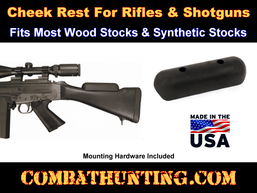 The Universal Cheek Rest Riser is a practical upgrade designed for both combat and hunting rifle and shotgun stocks, ideal for shooters who seek greater comfort and improved accuracy. Compatible with most wooden rifle stocks as well as synthetic aftermarket shotgun stocks like the tactical speed feed, this accessory provides a functional way to raise your eye level when aiming. Its main advantage, the universal cheek rest riser, lies in promoting a proper cheek weld when using a scope, which translates into steadier shots and increased precision during target shooting or hunting. Installation is simple and user-friendly—you only need to drill into your stock, then adjust and secure the cheek rest using the included hardware. With dimensions of approximately 4.95 inches in length, 1.40 inches in width, and a height of 0.75 inches, its size is compact yet effective. The Universal Cheek Rest Riser is crafted in the USA from durable, weather-resistant DuPont® extreme reinforced polymer; it sports a matte black finish that blends seamlessly with most stocks. Backed by a limited lifetime warranty, the Universal Cheek Rest Riser offers a reliable and lasting enhancement to your firearm setup, making it a worthwhile addition for anyone looking to improve shooting comfort and accuracy.