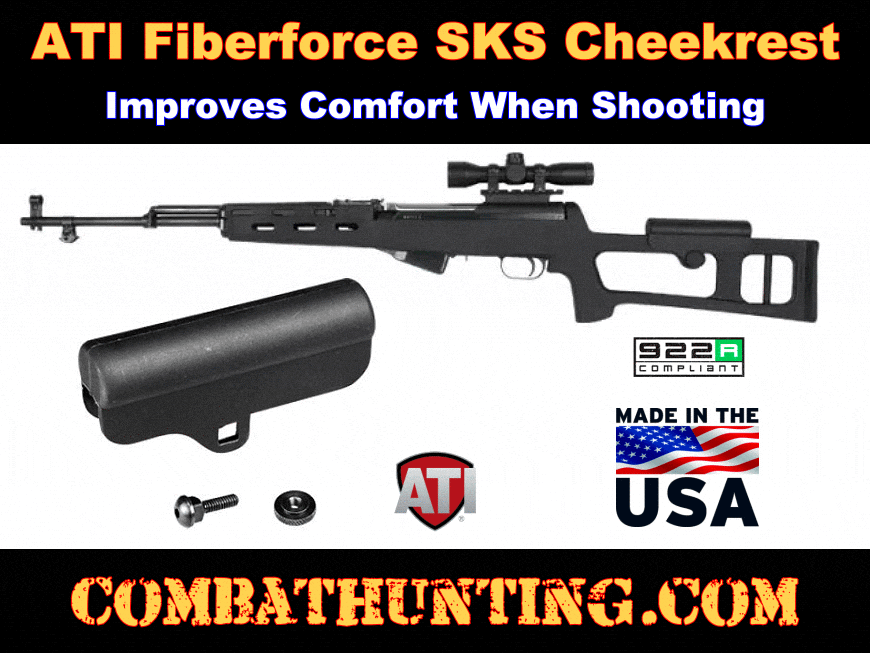 This ATI Fiberforce SKS Cheek rest Improves comfort when shooting. Fits: ATI SKS Ultralight Fixed Stock and Folding Stocks and ATI SKS Fiberforce Stocks. Has Room to Store a Cleaning Kit. Made From DuPont® Extreme Temperature Glass Reinforced Polymer. Manufactured in the USA. ATI Limited Lifetime Warranty.