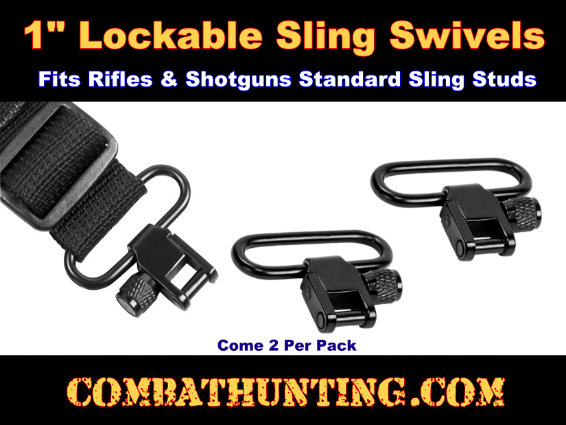 Sling swivels 1" for Rifles and Shotgun slings. Lockable Sling Swivels Fits most standard sling stud on rifles and shotguns. Lockable Sling Swivels Virtually Indestructible Metal Construction. Length: 1.25" Width: 1.6" Outside Width, 1.3" Inside Loop. Fits most standard sling stud on shotguns and rifles. Black Finish. Come 2 per pack.