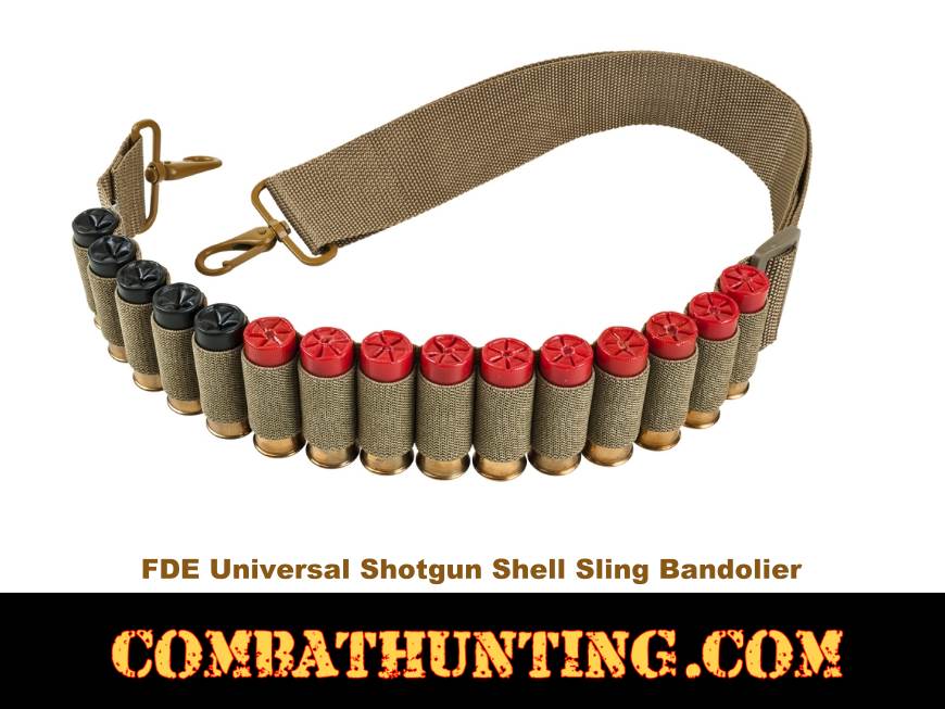 This Shotgun Shell Bandolier Sling in flat dark earth FDE hold 15 rounds it is perfect for combat hunting and tactical shotgun. This shotgun shell bandolier sling features snap hooks and fits most shotguns with sling swivel studs with loops. This fde combat-hunting shotgun sling shell holder bandolier holds 15 extra 12 gauge rounds and attaches to most standard sling swivels and loops with durable steel spring hooks. The shotgun sling is fully adjustable and constructed of high-quality elastic and 2 inches of nylon webbing. The non-slip backing keeps the shotgun sling in place. The Bandolier sling's maximum length is 51".