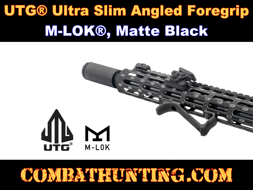 This Leapers UTG Ultra Slim M-LOK Angled Foregrip in matte black is a lightweight and ergonomic upgrade available to fit any M-Lok handguard, perfect for your AR-15 rifle. The Ultra Slim M-LOK Angled Foregrip is constructed from lightweight but rugged 6061-T6 aluminum. It adds virtually no extra weight to your gun but gives you comfort and reliable hand placement when handling your rifle.