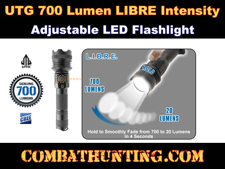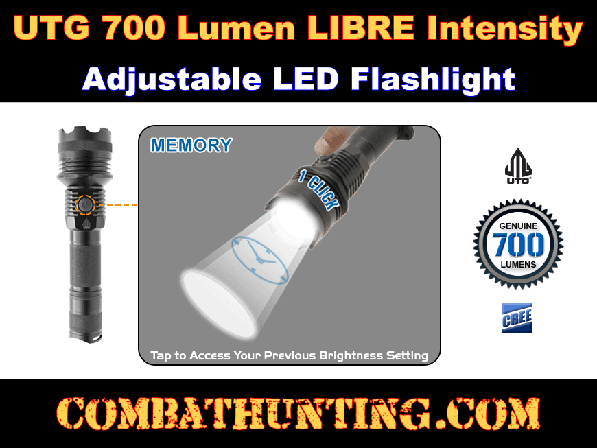 The UTG 700 lumen LED tactical flashlight with strobe function is specially designed for military, law enforcement, security and home defense applications. This military grade tactical flashlight with strobe function features an aggressively shaped bezel head for use as a force multiplier during self-defense. The tactical flashlight supports rechargeable CR123A and 18650 batteries and includes 2 x CR123 non-rechargeable batteries. The flashlight is precision machined from strong aircraft grade aluminum with a matte black hard anodized finish. The 37mm IRB provides a preset flood focus beam for quick and clear identification. long-range 700-lumen performance with a 2 hour run time at maximum output. Integral User Configurable Brightness Regulator with Memory Function, Scalable from 700 to 20 Lumens to meet your needs. The flashlight has a rubberized rear push button tail cap that features full power momentary and constant on/off with a rubberized rear push button tail cap. The Side-Facing Lumen Control Pad for easy adjusting of the LIBRE Brightness Intensity, Strobe Activation, and returning to the last used brightness setting is great for frequent use. The knurled and slotted tube body provides a secure grip for various hand holds, and a removable anti-rolling grip assist and standard grip spacer are included. The flashlight also has dual end-cap lanyard slots.