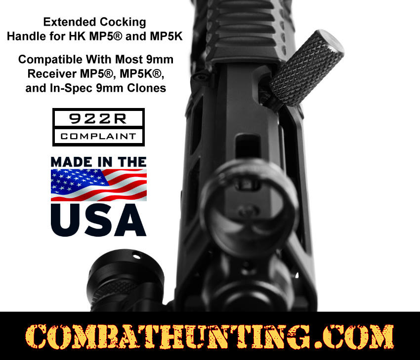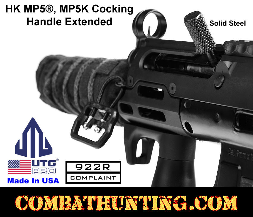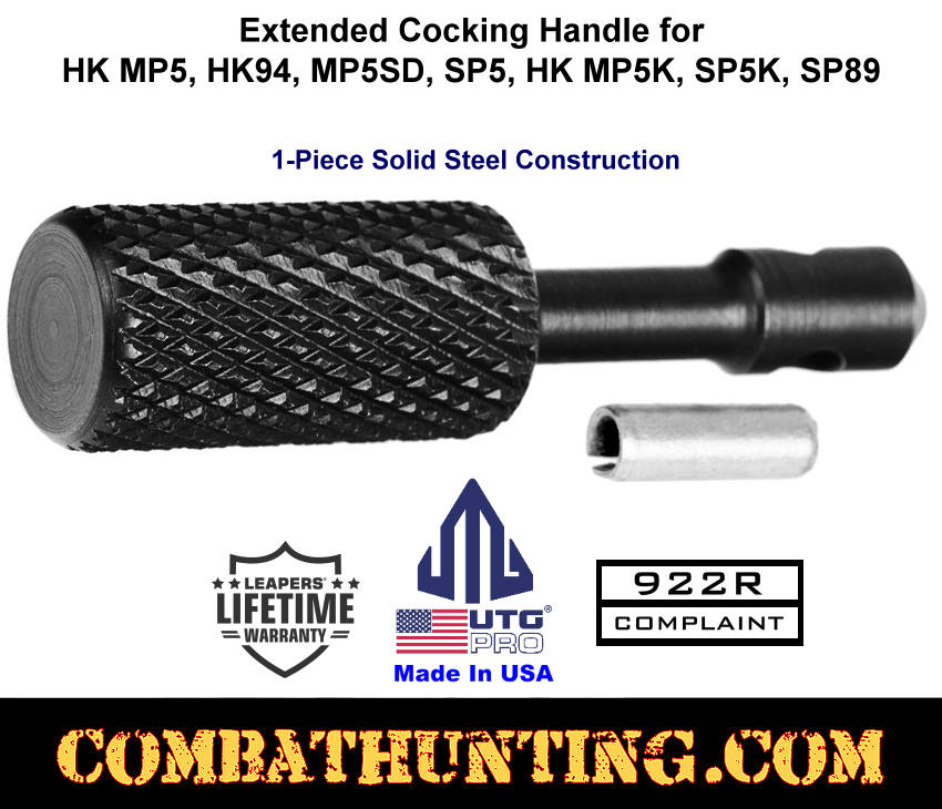 This UTG PRO® Extended Cocking Handle is for MP5® and MP5K firearms, including the HK MP5, HK94, MP5SD, SP5, HK MP5K, SP5K, SP89, and in-spec 9mm clones; it's ideal for HK 9mm builds. Whether you’re upgrading your tactical setup or maintaining your firearm for optimal performance, this aftermarket HK accessory charging handle offers a practical upgrade replacement suited for both combat hunting and recreational use. This extended cocking handle for the MP5® and MP5K is crafted in the USA and features a knurled surface that provides a reliable, non-slip grip, making it easier and faster to operate your firearm’s charging mechanism. Its robust steel design ensures smooth functionality even in demanding conditions. Notably, it also counts as one US-made part, helping users stay compliant with 922R regulations. Made to work with UTG Pro’s monolithic MP5 and MP5K M-LOK handguards and some others available for sale at combathunting.com, this cocking handle integrates seamlessly on compatible platforms. The quality and attention to detail reflect UTG Pro’s reputation for durable and efficient firearm accessories. Overall, this extended cocking handle is an excellent upgrade for anyone looking to replace their HK MP5, HK94, MP5SD, SP5, HK MP5K, SP5K, or SP89 charging handle. It combines enhanced grip, ease of use, and American manufacturing standards into one reliable component. For those seeking a dependable and thoughtfully engineered charging handle, this model is a solid choice that won’t disappoint, backed by a lifetime warranty.