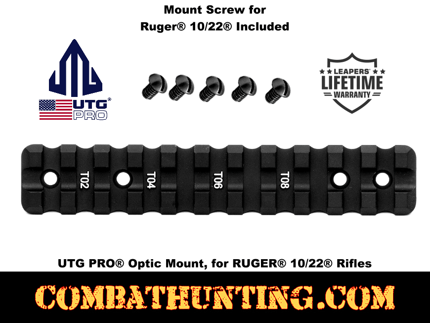 The Leapers UTG PRO Ruger 10/22® Picatinny-Weaver rail mount is designed specifically for Ruger 10/22 rifles, offering a solid and versatile platform for attaching red dots, scopes, and other optics. Made in the USA from precision-machined aircraft-grade aluminum, this mount features a durable matte black hard coat anodized finish, ensuring both strength and a sleek, professional look. With its contoured bottom and exact fit for Ruger 10/22 Carbine Autoloading Rifle models, the mount aligns perfectly with the factory-drilled and tapped screw holes on the receiver, providing secure placement without the need for modifications. Its low-profile design includes a U-cut for weight reduction and measures 4.67 inches in length, featuring 11 Picatinny rail slots. This versatile slot configuration allows for mounting various sights and optics while enabling flexible positioning to achieve optimal eye relief. Installation is straightforward and user-friendly, with assembly screws included—no gunsmith is needed. Backed by the UTG Pro limited lifetime warranty, this rail mount offers a reliable and practical upgrade for Ruger 10/22 owners seeking to enhance their shooting experience with custom optical setups.